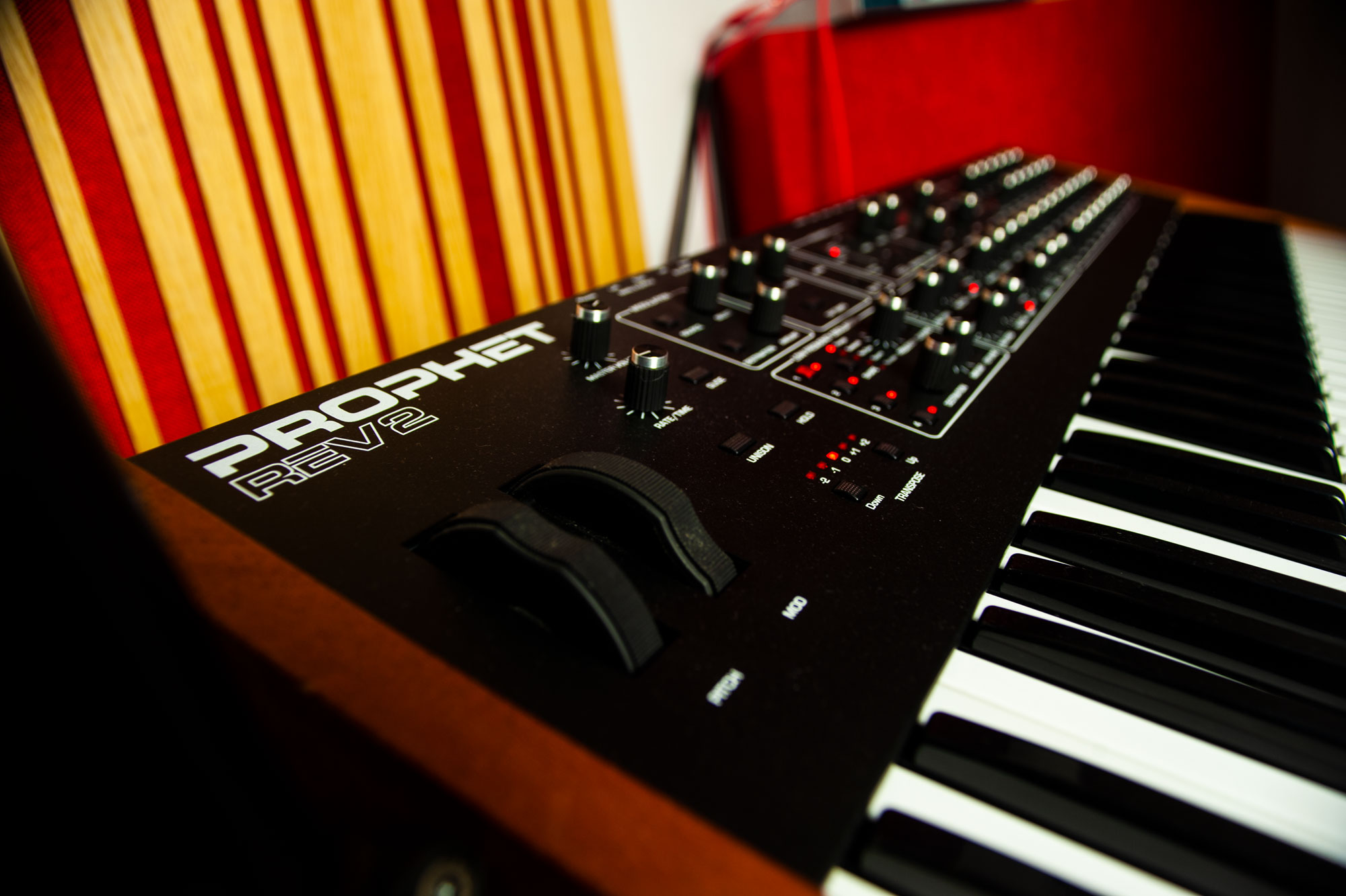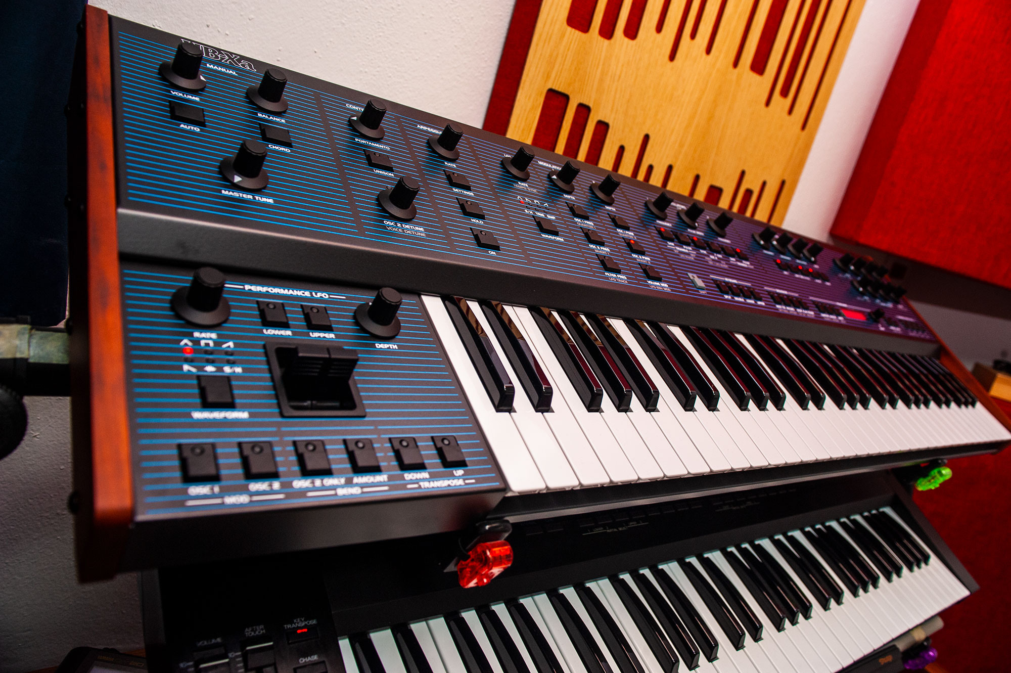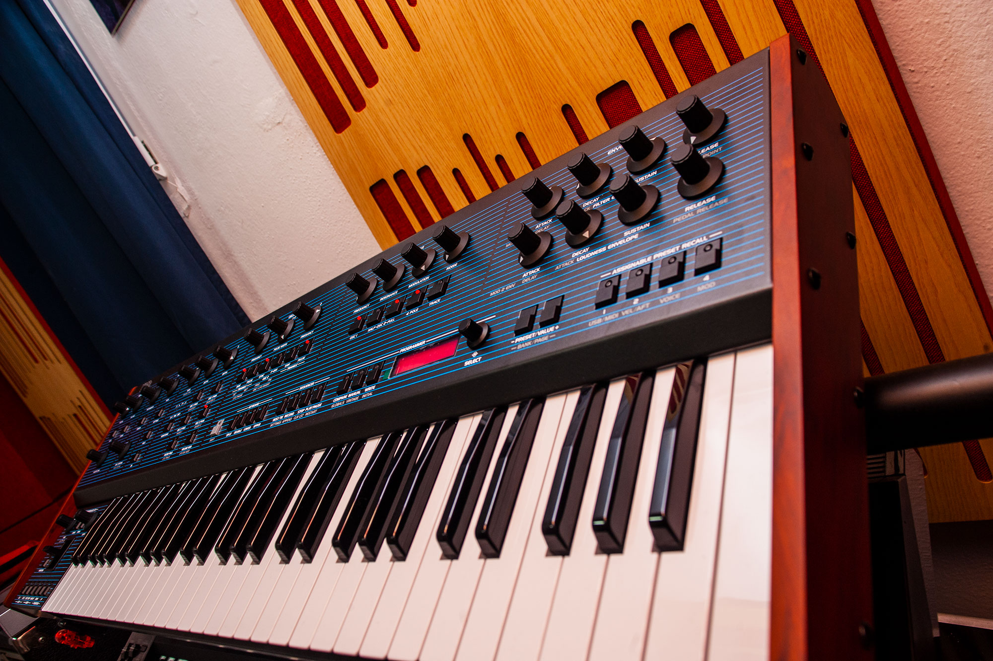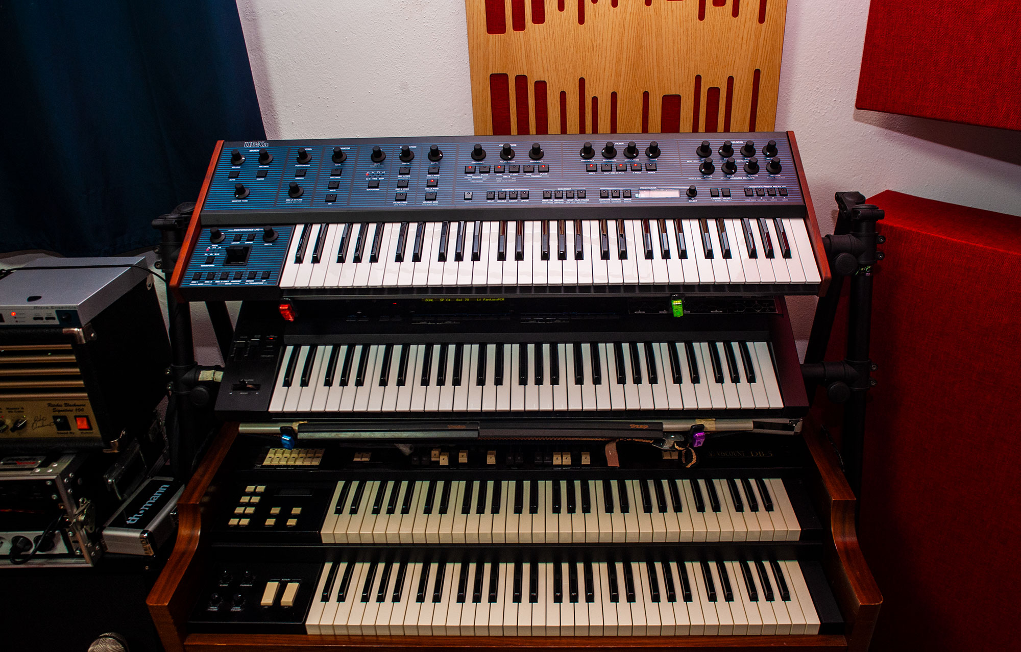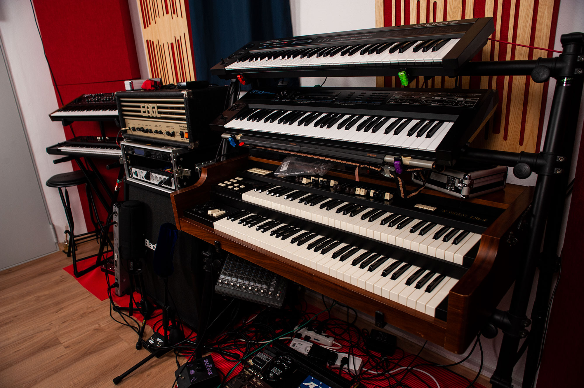 Keyboards are also present: Viscount db5 hammond clone, roland d50, daves smith prophet rev 2, roland alpha juno 2 and roland vr09, all ran thru a mackie mixer. Two condeser mics offer two different choice for voice recording: a akg C214 and a Rode Nt2-a complete the set.