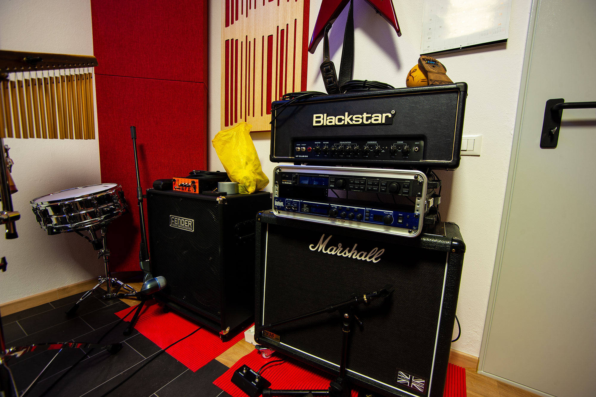 Two guitar rigs are present: BLACKSTAR HT50 club head with a MARSHALL 1936 cab and an ENGL RITCHIE BLACKMORE with a BLACKSTAR 4*12 cab, both rigs have a G-MAJOR multieffect connected. I use to track the engl one with two GOLDEN AGE ribbon mics, on R1 and one MK3, as I love their warm and definite sound, and two room mics (SE ELECTRONICS), two Shure SM57, hanging on the opposite wall!